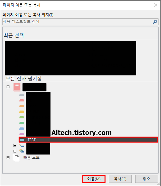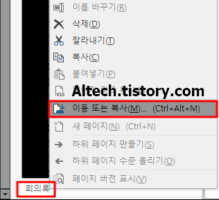 복원할 페이지나 섹션의 탭을 우클릭 하여 이동 또는 복사를 선택합니다.
